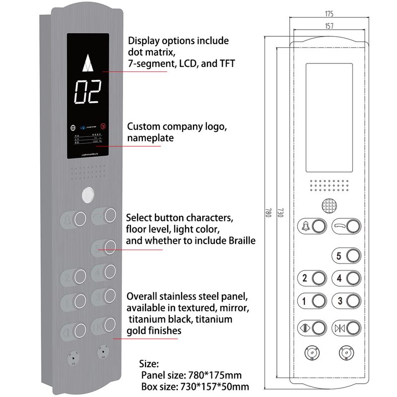 表面に設置された制御パネル:別々の囲い構造がない.通常はボタンを設置する.ディスプレイモジュールを直接パネル上に設置し,特定の設置方法によりエレベーターキャビンの壁に固定する電気コンポーネントは,通常,保護のために追加的な閉ざされた箱に頼らずに,パネルのすぐ後ろに設置されます.